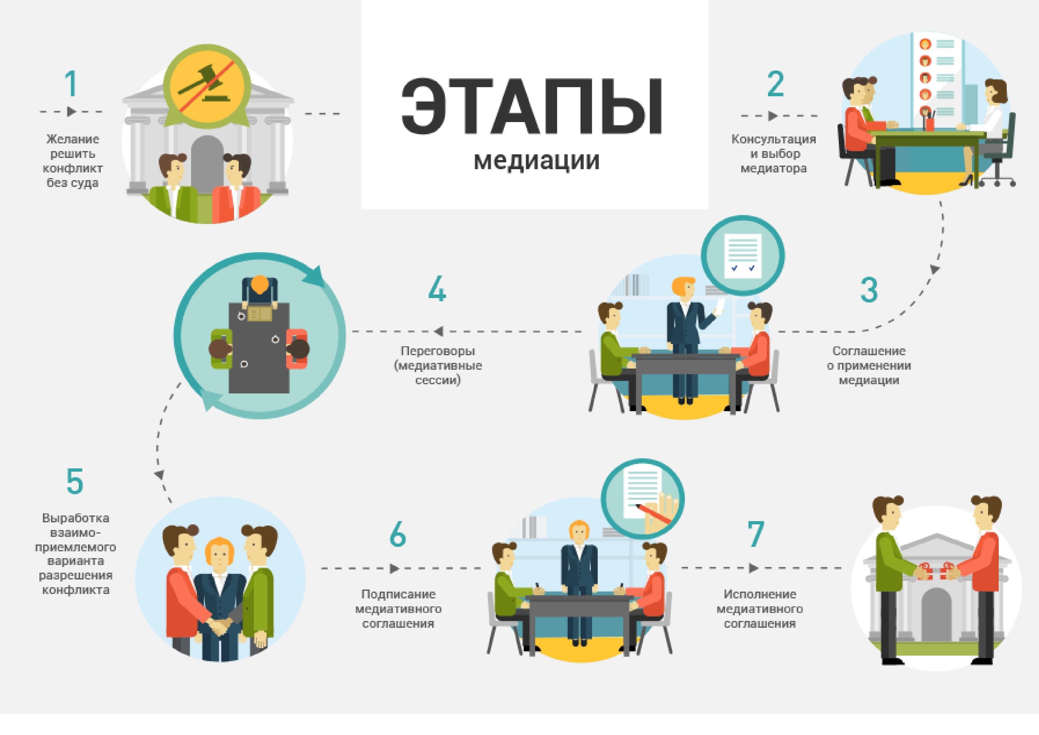 Медиация — это процедура, в ходе которой стороны конфликта пытаются найти общее, устраивающее всех решение при помощи третьего, нейтрального лица – медиатора. Медиатор не принимает решения ни за какую сторону, он только организует процесс переговоров, в ходе которого стороны конфликта могут обсудить претензии друг к другу, обнаружить недостающую информацию, выработать список общих вопросов, подлежащих разрешению и договориться.